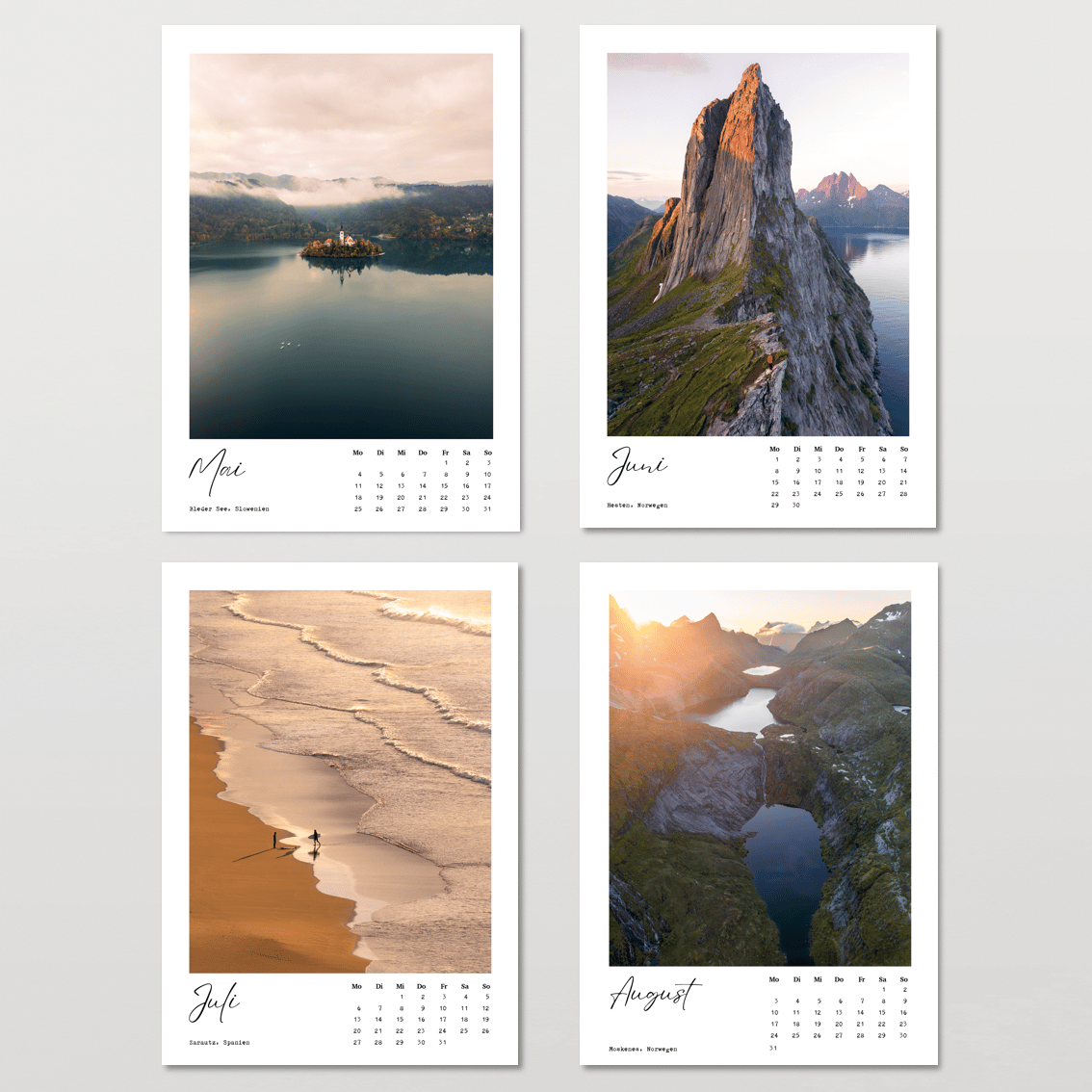 Dieser Wandkalender 2026 nimmt dich mit auf eine Reise zu einigen der faszinierendsten Orte in der Schweiz, Frankreich, Norwegen, Spanien, Slowenien, Italien, Österreich und Deutschland. 🗺️ Jede Fotografie fängt die einzigartige Schönheit dieser Destinationen ein und bringt die Magie der Natur direkt zu dir nach Hause. Ob für dich selbst oder als Geschenk für andere – dieser Kalender ist perfekt für Abenteurer, Naturfans und Tagträumer.✨
